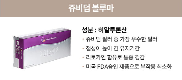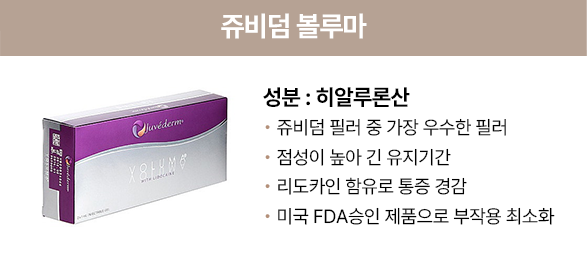안정된 필러로 시술 후의 이동이 적고 리도카인 성분이 함유되어 시술 후의 붓기와