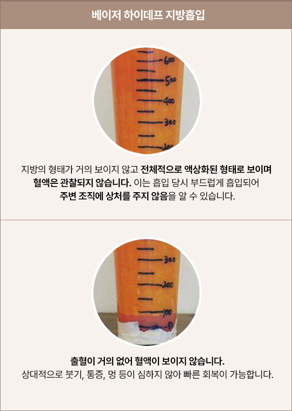 현존하는 최고의 장비인 베이저 하이데프(최첨단지방흡입기기)를 사용하여